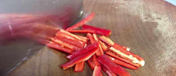 3、準備兩根紅線椒,從中間給它切成兩半,再用刀把它平均分成四份,最後也把它切成三厘米長的小段,這是用來配色的,切好之後裝入碗中備用。