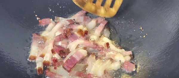 6、鍋熱後放入少量的食用油,把臘肉倒下去爆香,炒出臘肉的油脂,炒至臘肉的表面微微發黃。