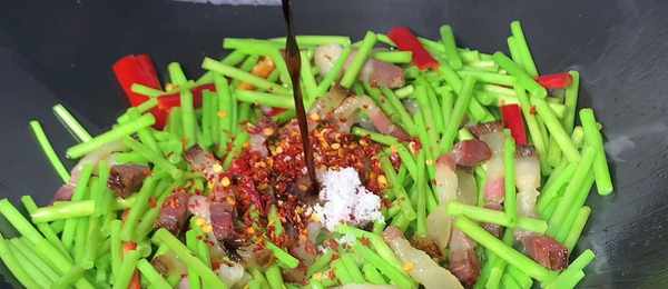 8、最後再放入剛才切好的蒜,翻炒至蒜斷生,最後再加入一點點蠔油提鮮,快速地翻炒均勻,一道香辣脆爽,好吃又下飯的藜蒿炒臘肉就做好瞭。