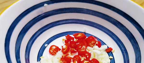 2、接下來把大蒜先切成片,再切成蒜末,小米辣切成圈,和大蒜放在一起,放入碗中備用。
