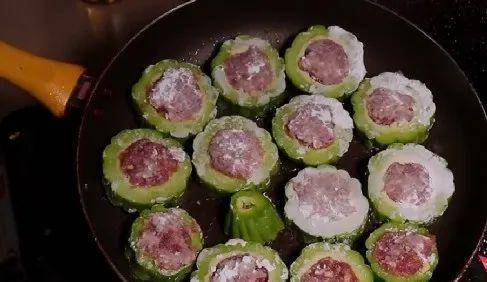 5.在鍋裡燒油,油燒熱後轉至小火,將苦瓜全部下入鍋中,煎至到苦瓜內壁的肉餡基本定型後翻面,待兩面焦黃盛出備用。