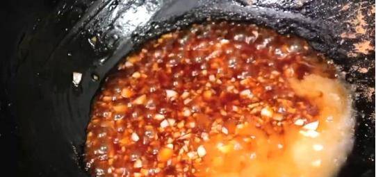 4.然後起鍋燒油,將蒜末倒入鍋中翻炒出香味,接著把調至好的料汁倒入,調至小火煮開,然後倒入適量的淀粉水勾芡成汁,煮至變成濃稠狀即可關火收汁。