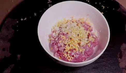 2.接著拿一塊新鮮的豬肉,用水沖洗幹凈去除血水雜質後,切成小塊,再剁成肉沫,放置碗裡;同樣把薑和大蔥剁成碎末,香菇洗凈後剁碎,一同放置在裝有豬肉的碗裡。