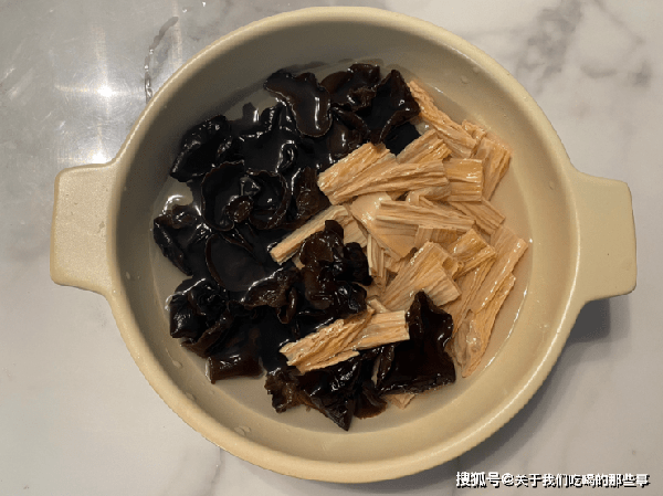 2、冷鍋冷油放入花生米,小火翻炒至顏色金黃,熟透後盛出放涼。另起鍋,燒一些開水,加一勺鹽,放入腐竹、木耳煮2分鐘,撈出過涼水,瀝幹水分。