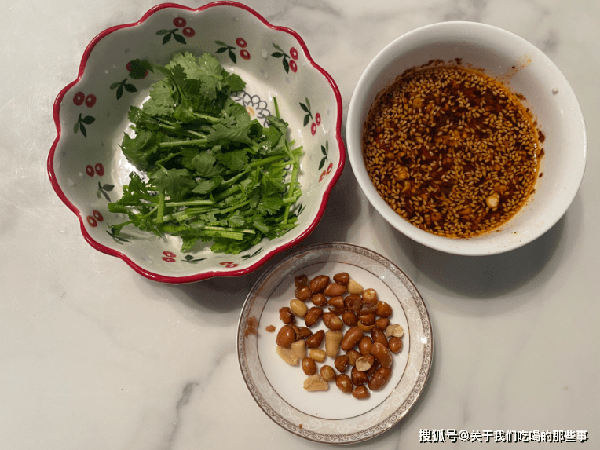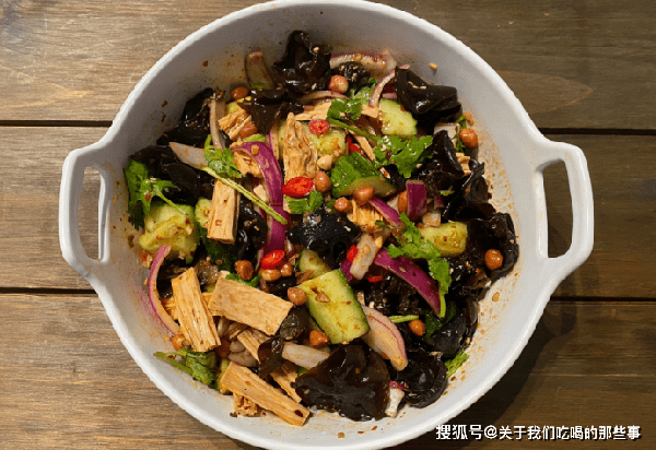 準備木耳、腐竹、黃瓜、洋蔥、花生米、食鹽、生抽、香醋、香油、辣椒油。