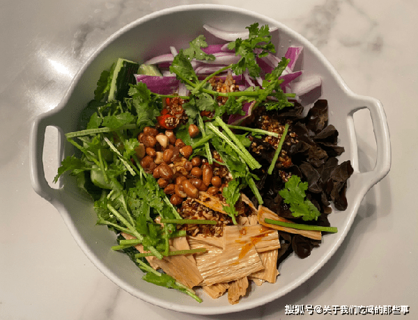 4、把花生米、腐竹、木耳、黃瓜、洋蔥放在一起,加一點香菜末,倒入調好的料汁,帶上手套,將醬汁與菜抓拌均勻即可。