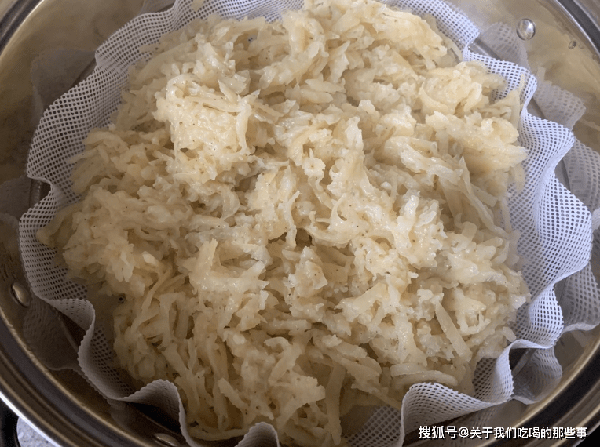 1、土豆去皮洗幹凈,擦成土豆絲,用水淘洗掉表面的淀粉,瀝幹水分後加入花椒面、面粉,用手翻拌均勻,讓每根土豆絲上都沾上幹粉。
