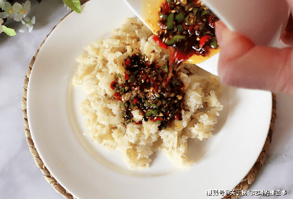 3、碗裡放入蔥花、蒜末、辣椒碎,再放入一勺辣椒面,鍋裡倒入食用油燒熱,潑入小碗中攪拌均勻,加入適量鹽,生抽、香油,醋,熟白芝麻攪拌均勻,澆在土豆絲上拌勻即可。