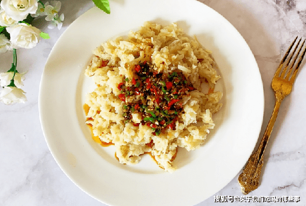 2、蒸鍋加水燒開,鋪上籠佈,放上土豆絲,蓋上蓋子蒸10分鐘,蒸熟後取出,趁熱抖散,放入盤中晾涼。蔥切成蔥花,蒜壓成蒜末,辣椒洗凈切碎。