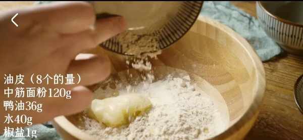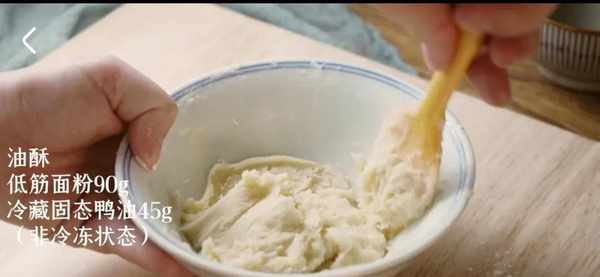 這裡為瞭讓油酥更容易起酥,我們用的低筋面粉90克,搭配鴨油45克。