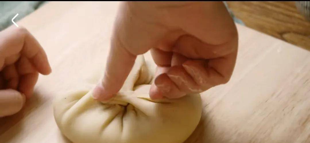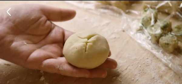 將油酥包裹在油皮中,捏成包子的形狀,再次搟成面皮,然後卷成長條。
