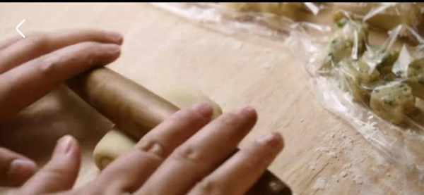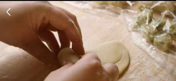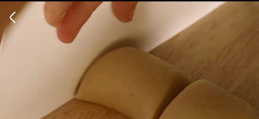 用搟面杖,把劑子搟成牛舌狀,然後卷起。