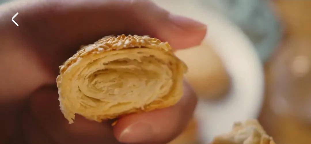 一個完美的鴨油酥燒餅,必須外皮焦黃酥脆,內裡也是酥軟千層,這個千層的效果就是鴨油酥的精髓所在瞭。
