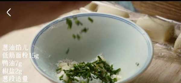 低筋面粉15克,鴨油7克,椒鹽2克,蔥花適量,一起拌勻。