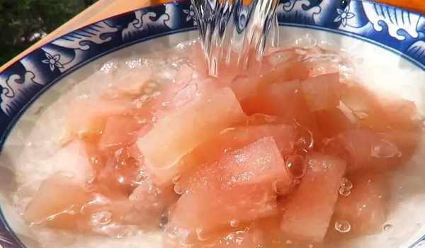 2,把白色瓤處理好後,切成均勻的小塊。把所有切好的白瓤全部放進大碗中,加入清水,浸泡10分鐘。