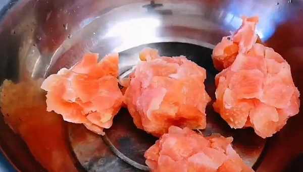 4,把煮好的柚子皮撈出,倒入大盆中,然後加入清水,用手把柚子皮的水分擠幹,接著再把柚子皮放進盆中,繼續讓柚子皮吸水,重復鞋這一動作多次。這樣做的目的是:讓柚子皮內的苦澀味完全被擠出來,這樣吃的時候就不會影響口感。