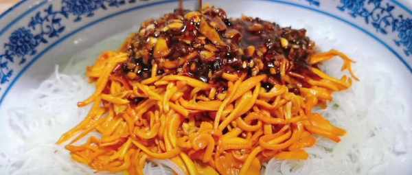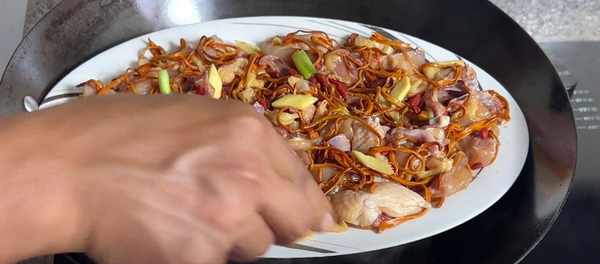 7、下面用剛才拌好的調料,倒在米絲和蟲草花上面,再用筷子給它拌勻就可以吃瞭,一道非常好吃的涼拌菜,蟲草花拌米絲就做好瞭,麻辣鮮香的,非常好吃,可下飯當零食,喜歡的朋友,趕緊收藏起來試試吧。