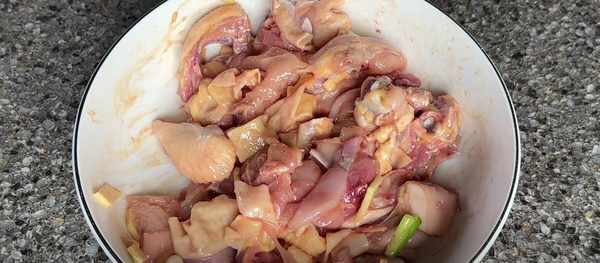 1、準備一半新鮮的雞,先把內臟充分地清洗幹凈,內臟清洗不幹凈會有腥味,清洗幹凈後,先把雞翅和雞腿切下來,然後再斬成小塊。