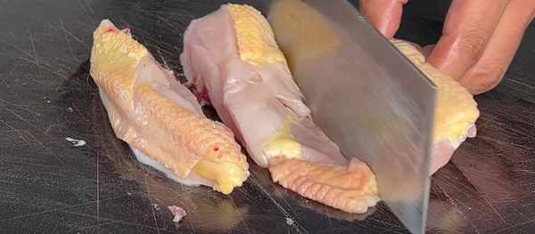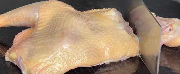 2、買雞的時候,最好買那種散養的土雞,這樣的雞肉氣質就會香很多,把雞肉斬成小條,再斬成均勻的小塊,這樣蒸的時候比較容易熟一些,雞腿最好一刀把它斬斷,反復的斬會有很多碎骨,影響口感。
