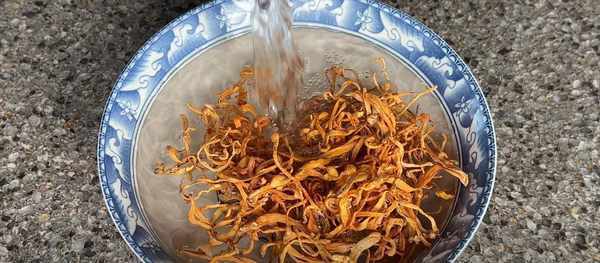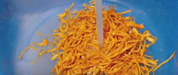 2、米絲泡好之後,將買回來的蟲草花放到盆裡,然後用清水給它洗幹凈,洗幹凈之後,就撈出來控水放一旁備用。