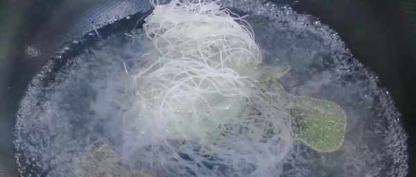 5、鍋裡燒水,將米絲煮一下,鍋裡面來一點點的油,這樣煮出來的米絲,顏色看起來就比較好看,手輕輕掐一下,輕輕就可以掐斷,就給它撈起來,米絲撈起來之後,迅速地給它攤散,讓米絲能快速地降溫。