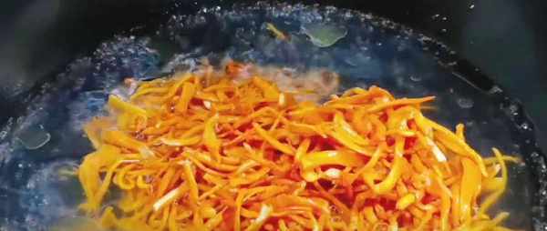 6、將蟲草花也放進鍋裡面煮一下,蟲草花它不是蟲草,實際上它也是一種菌類,這個煲湯非常的好,特別的鮮,所以說也不能煮的太久,煮個三兩分鐘就差不多瞭,給它撈起來放在盤子裡面。
