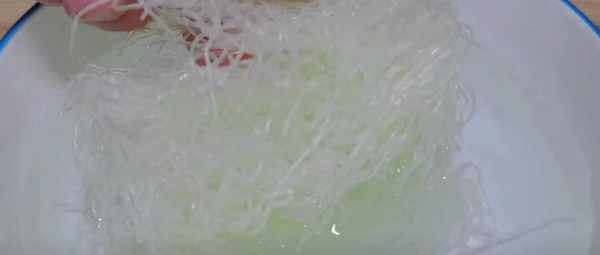 1、準備一塊米絲,放入大碗裡,加入清水給它泡軟,泡軟之後再拿去煮一下,這一步等下再操作。