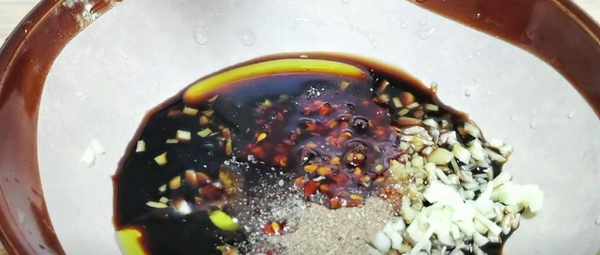 4、全部切好後,給它放入碗裡面,加入適量的生抽,醋要比生抽稍稍多一點點,香油,花生油都可以,適量的鹽,適量的雞精粉,兩勺的白糖,再來一點花椒面,最後再來一點涼拌菜的靈魂辣子油,一起給它攪拌均勻。