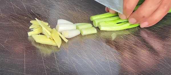 3、洗好之後,來切一點佐料,生薑,大蒜,大蒜拍一下,剝皮就比較容易一點,生薑大蒜全部切細。