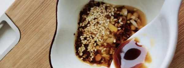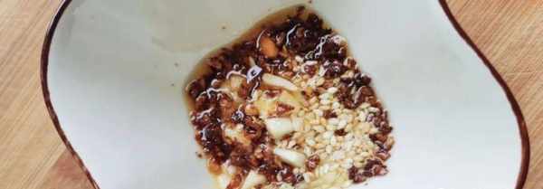 2.準備個料汁,碗中放入白芝麻,蒜泥,辣椒粉,然後燒一點熱油,淋上去炸香材料。