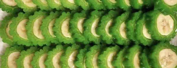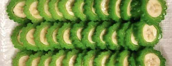 6.釀滿的苦瓜把多餘的香蕉切掉,跟苦瓜口平齊,這樣才好看。