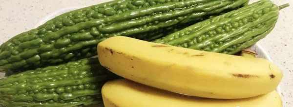 1.準備兩根新鮮的苦瓜,要選擇形狀大小一致的,最好跟香蕉一樣有弧度,然後選三根新鮮的熟香蕉。