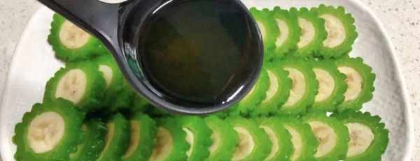 7.然後把釀好的苦瓜再切成一片片的薄片就可以瞭,大概0.5厘米左右,擺盤,然後淋上一兩勺蜂蜜在面上,就可以開吃瞭。