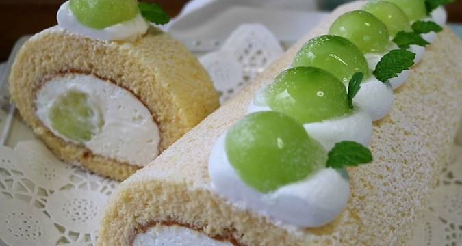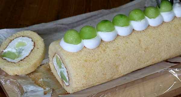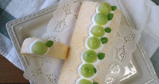 7.把哈密瓜用勺子挖出圓球形,碼放在奶油表面,將蛋糕卷起來,做成漂亮的形狀,一定要卷緊,放在冰箱裡冷卻。