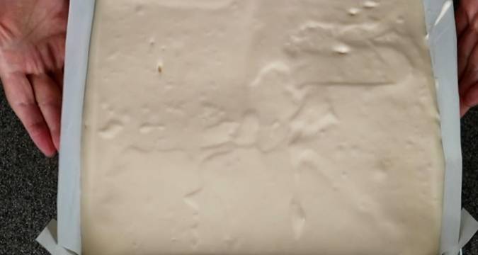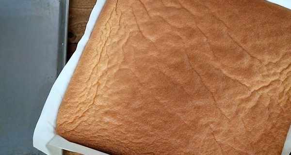 5.烤好後,迅速從烤盤上取下,放在蛋糕冷卻器上冷卻。當蛋糕涼瞭,把它從油紙上拿出來。