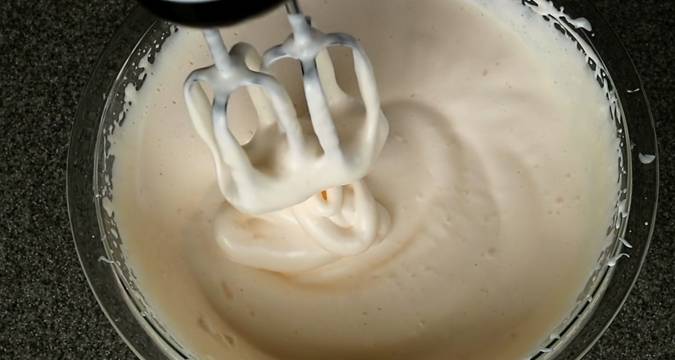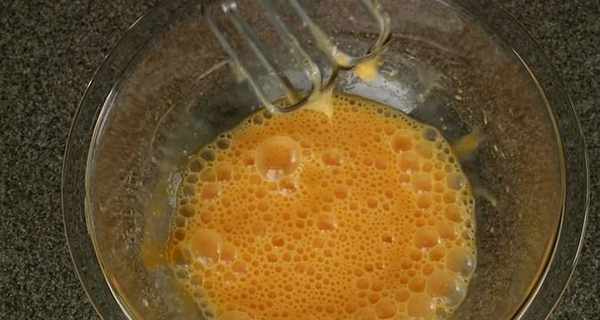 2.把雞蛋放入在40℃的熱水中隔水加熱到溫熱(當達到體溫時,從水中取出碗),加入細砂糖。用手動打蛋器快速攪拌,直到變稠發白,提起打蛋頭,像緞帶一樣滴落下來的狀態。