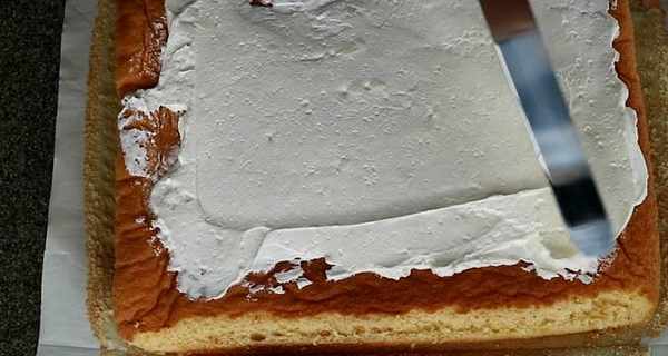 6.把鮮奶油塗在棕色的蛋糕一面(鮮奶油餡兒的做法,將奶油幹酪放回室溫,用打蛋器將淡奶油加入細砂糖進行打發,然後加入奶油幹酪打至順滑即可)。