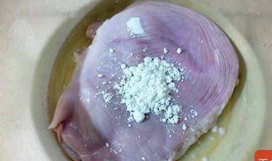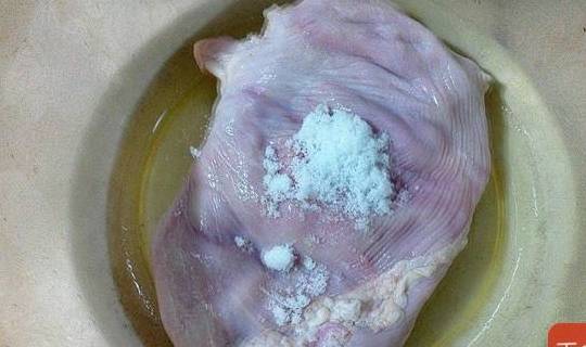 2.豬肚用生粉反復清洗正反面、再用清水沖洗、(反復清洗幾次、這時候豬肚基本上沒什麼腥味瞭)