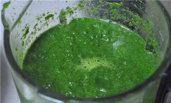 將處理好的葉子稍微切斷,放入破壁機中,加入少許小蘇打,打成泥。