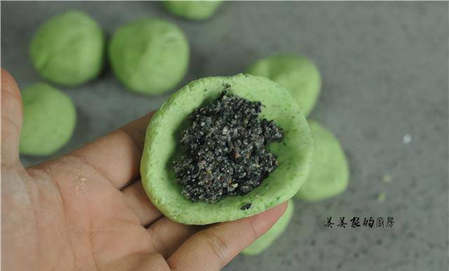 舀一勺黑芝麻花生餡鋪在中間,收口捏緊,稍微按扁成餅狀。