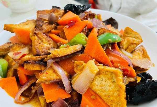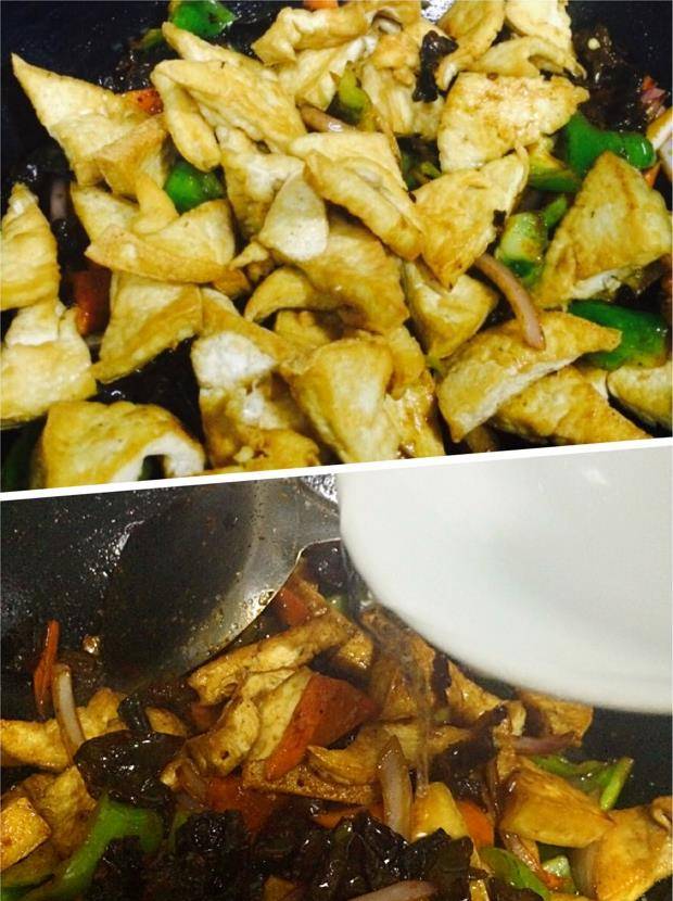 1、豆腐洗幹凈,切成三角塊。胡蘿卜去皮洗幹凈,切成菱形片。青椒去蒂,洗幹凈後切塊。洋蔥去皮切塊,黑木耳提前泡發,洗幹凈後撕成塊,生薑切末。
