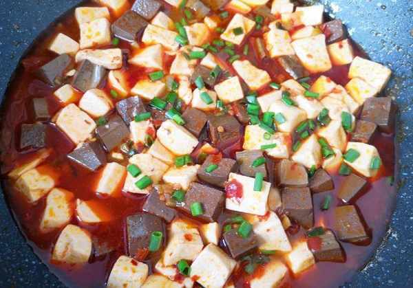 2、起鍋燒油,放入薑末、蔥花炒香,加入一勺豆瓣醬炒出紅油,倒入一些清水煮開,放入焯過水的鴨血、嫩豆腐,小火煮5分鐘,加入適量食鹽、雞精、白糖,淋入適量花椒油,撒上蔥花即可出鍋。