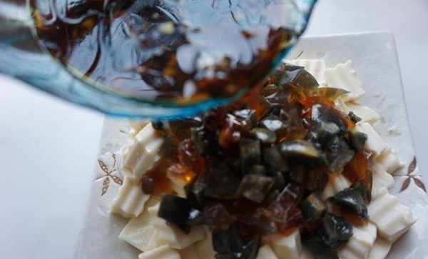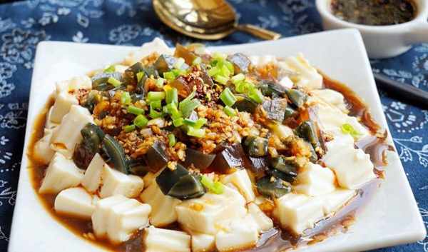 2、皮蛋放入鍋中,加清水煮5分鐘,撈出剝掉蛋殼,用刀切成小瓣,一個切4~6瓣即可。把嫩豆腐切好放入盤中,上面放上嫩豆腐,澆上調好的料汁即可。