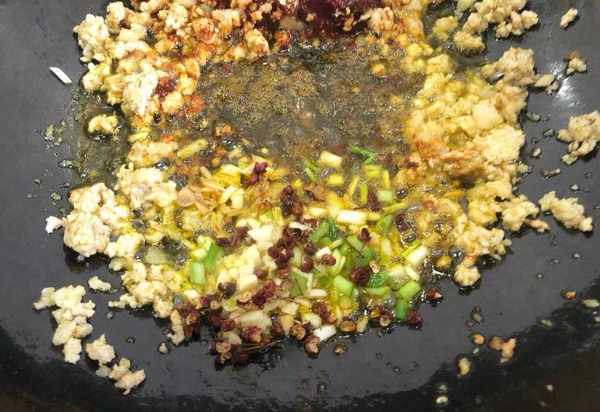 2、起鍋,倒入適量油,放入肉末小火炒一會兒,顏色焦黃後放入一勺豆瓣醬,炒出紅油後放入蔥薑蒜末、花椒炒出香味,加入老抽翻炒上色。