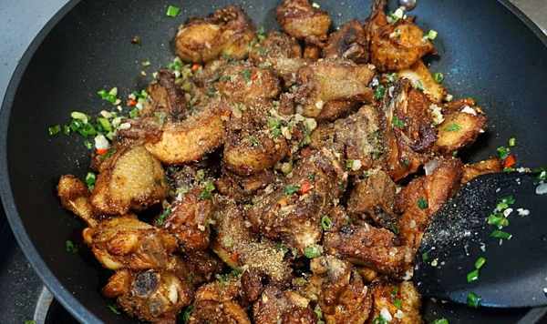 第五步,準備炒鍋,鍋底撒少許食用油,大火爆炒蔥薑蒜末,炒出香味,再加入青紅辣椒丁,洋蔥丁,翻炒幾下,將炸好的排骨放入鍋中繼續翻炒,然後撒上適量椒鹽,翻炒均勻即可起鍋。
