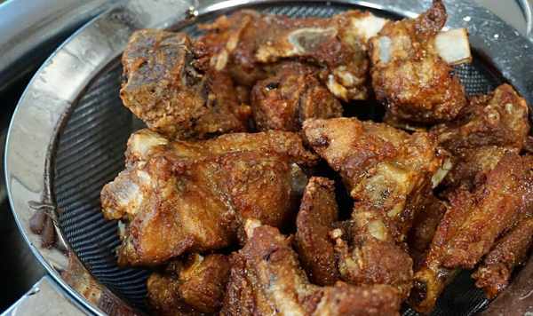 第四步,油鍋倒入足夠量的食用油,加熱至5成熱,將醃制好的排骨下鍋進行油炸,油鍋火候,控制在中小火,炸至金黃色,然後再轉大火快速炸5~10秒鐘,起鍋瀝幹油備用,要記得炸至金黃色後一定要大火速炸幾秒鐘,這樣排骨不僅外焦裡嫩,關鍵是還能有控油的效果,炸出來的排骨油少,口感不膩,肉香濃濃。
