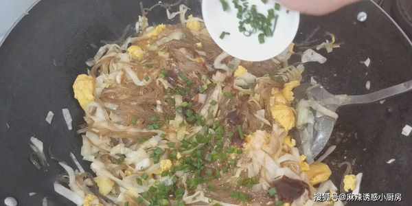 第七步:包菜絲炒至差不多全熟,加入適量的鹽,醬油,翻炒均勻,再倒入雞蛋,粉條,翻炒均勻,要快速翻炒,不然很容易糊鍋的,翻炒均勻後,再來點胡椒粉,蠔油,蔥花,再次把它翻炒均勻。