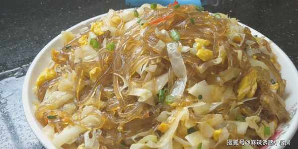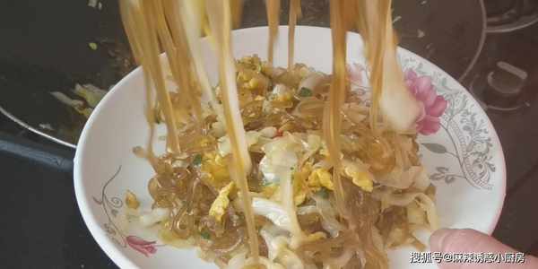 粉條下鍋後,很容易糊底,所以大傢可以調小火一點慢慢炒,也可以稍加多點油炒,不過早餐不建議吃太油膩,所以還是調中小火慢慢炒吧,喜歡吃肉的朋友可以加點肉絲,味道更好哦。