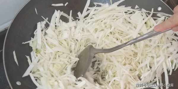 第六步:鍋中再下油,倒入提前準備好的蔥蒜末,把它們爆香,爆香後加入包菜絲,把它炒熟。
