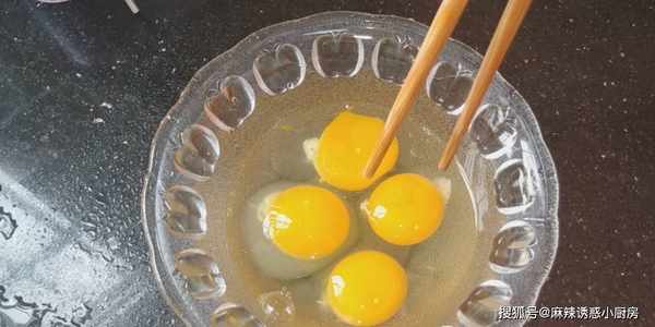 第四步:準備幾個雞蛋,我這裡準備瞭四個,打入碗中,加少許鹽,把雞蛋打散。